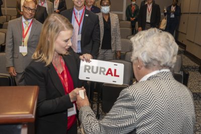 Brenda Tuck, rural development manager for the Alabama Department of Commerce, presents Gov. Kay Ivey with a car tag displaying the ‘RurAL’ brand at the Rural Economic Development Summit, Wednesday, Oct. 27, 2021. (Image: Governor’s Office/Hal Yeager)